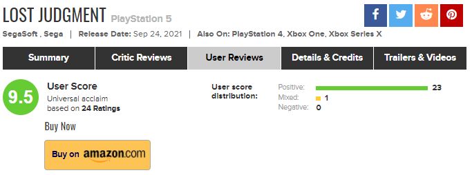 キムタクが如く2のユーザースコアがやばい 2021/9/28 Y速報 " " 1: 2021/09/27(月) 13:52:03.15 ID:i3958K2T0 https://www.metacritic.com/game/playstation-5/lost-judgment GOTYも狙えるぞ 続きを読む Source: Y速報