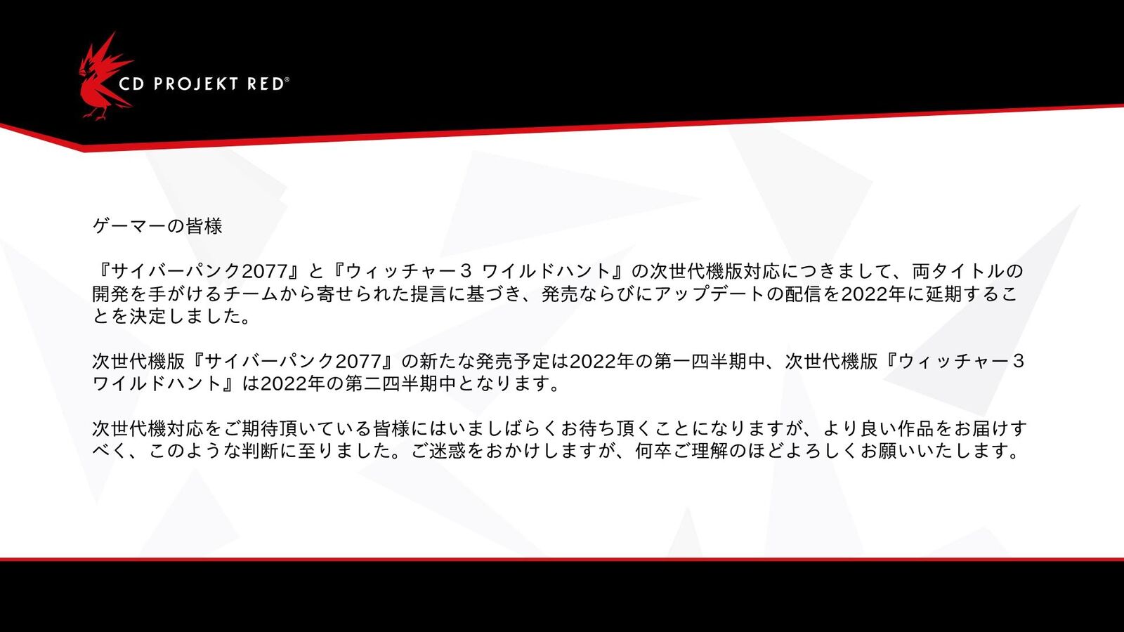 CD PROJEKTは、2021年後半の発売を予定していた『サイバーパンク2077』および『ウィッチャー3 ワイルドハント』の次世代機版を2022年に延期することを発表しました。