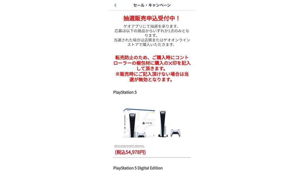GEOによる転売対策の対象となっているのは、同社アプリ限定の抽選販売。11月22日から11月25日までの期間限定で、1人1台までPS5購入抽選に応募できる。アプリ内で応募ページを開いてみると、赤く目立つ注意書きが目に入る。