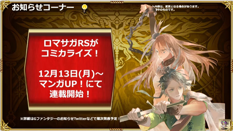 【3周年生放送】速報!12月13日~「マンガUP」でRSがコミカライズ化!漫画化だぁ!【ロマサガRS】 2021/11/27 ロマサガRS攻略まとめ " " 523 名前ボストン速報:2021/11/27(土) 21:35:43.85 ID:SBA ロマサガRSコミカライズきたああああああああああああああ 続きを読む Source: ロマサガRS攻略まとめ