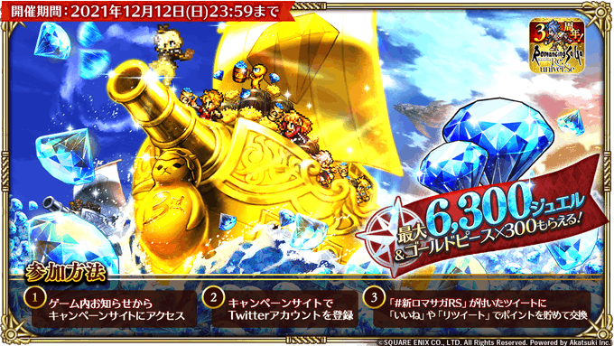 ロマサガRS祝3周年記念キャンペーン開催!💎最大6,300ジュエル&ゴールドピース×300GETのチャンス!#新ロマサガRS が付いたツイートに「いいね」や「RT」で「ロマサガポイント」を獲得してアイテムと交換しよう!
