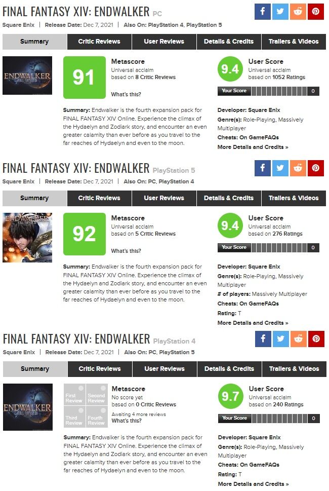 【朗報】FF14暁月のフィナーレ、ユーザースコア最高9.7、メタスコアも最高92 2021/12/20 Y速報 " " 1: 2021/12/19(日) 15:46:10.94 ID:cWfOIhez0 PCPS4PS5どれも安定して高くPS4版は驚異のユーザースコア9.7 PS5版はメタスコア92、ユーザースコア9.4と今年のGOTYタイトル全てより高め これは吉田が作るFF16も期待できそうだね 続きを読む Source: Y速報