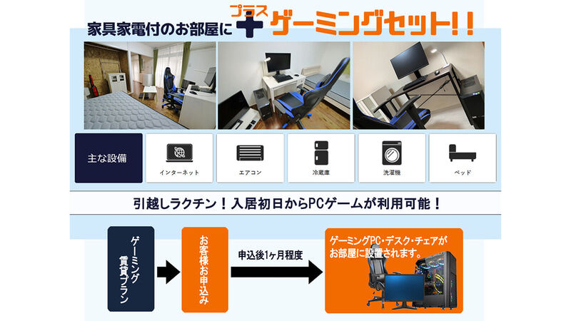 ゲーミングPC/液晶/チェア付きで家賃4万円台からの「ゲーミング賃貸プラン」