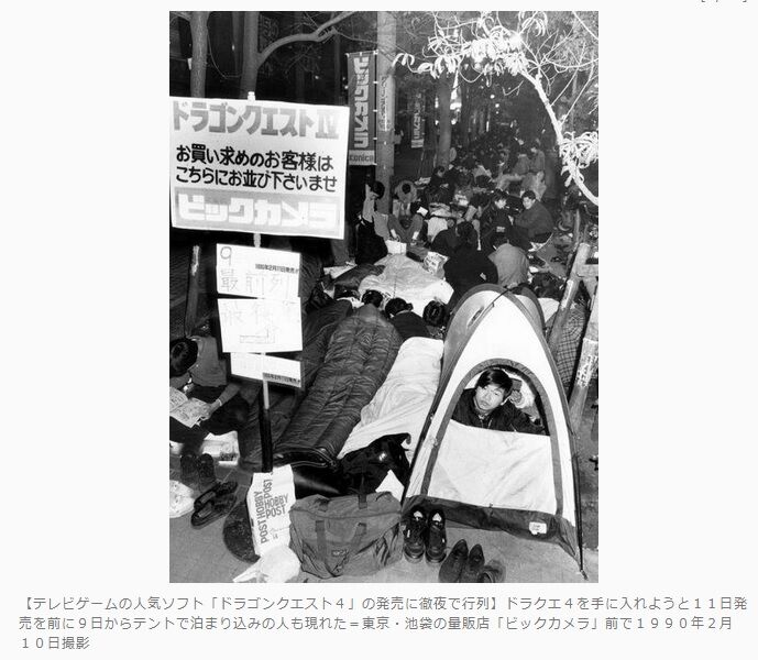 家庭用ゲーム機初のRPGとして、1986年に登場した『ドラゴンクエスト』。その後、ドラクエIII・IVが話題となり、発売日には徹夜組を含む5000人~1万人が長い列を作った。