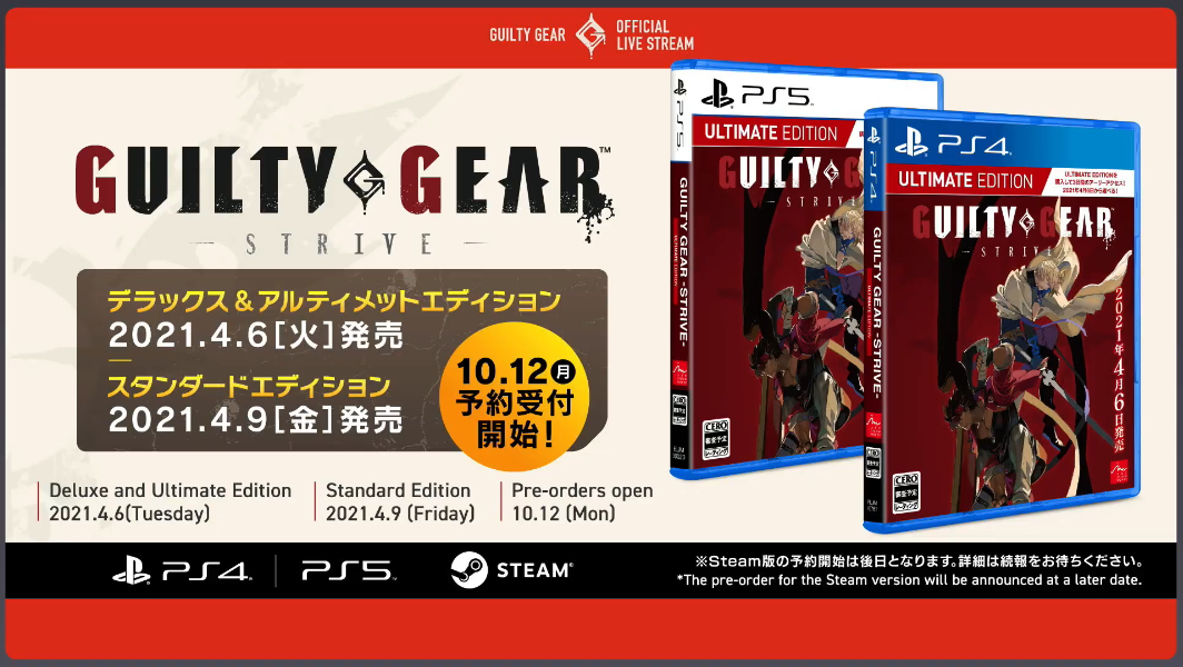 【格ゲー】『ギルティギア ストライヴ』2021年4月9日に発売日が決定!無料体験版(オープンβ)の実施も発表 2020/10/11 PS5速報! " " 『ギルティギア ストライヴ』発売日が2021年4月9日(金)に決定!※更新(情報追記、訂正) 続きを読む Source: PS4速報!