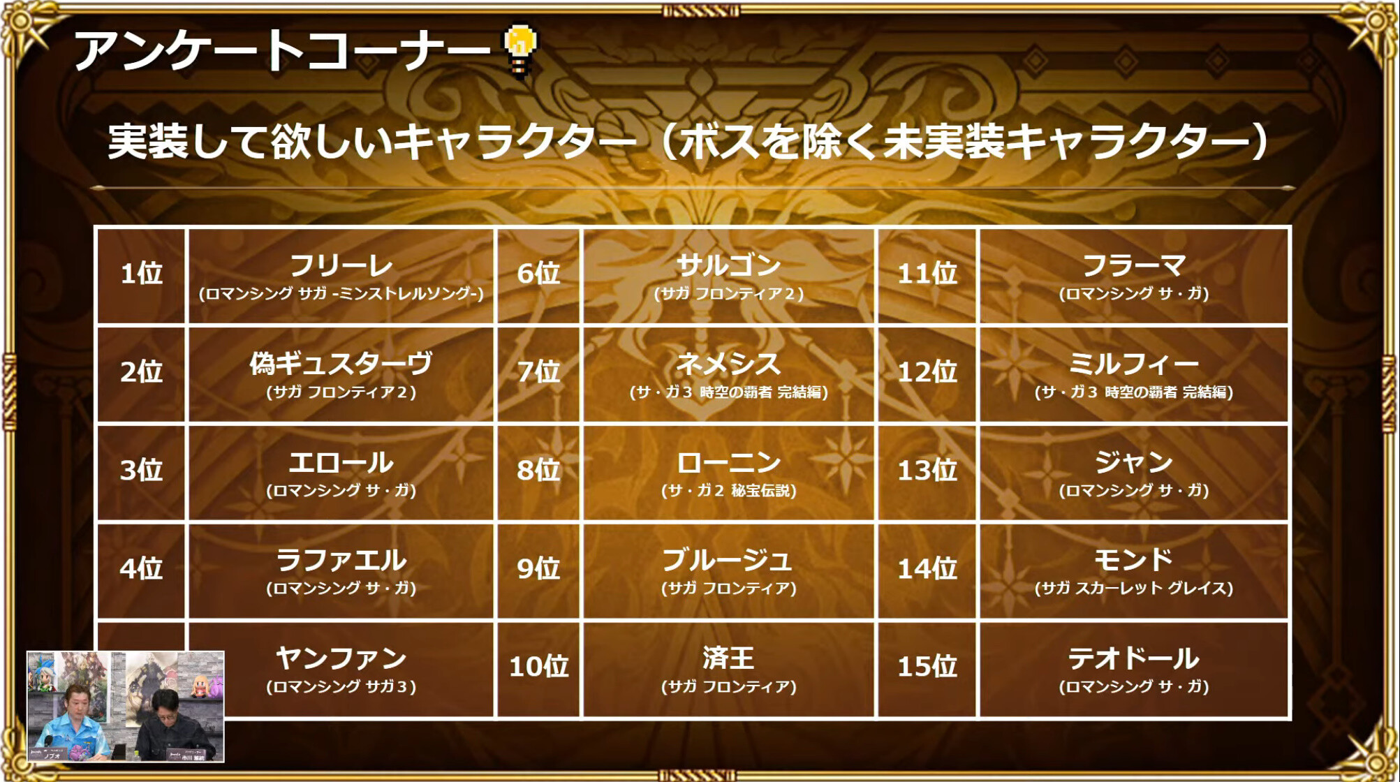 *コメ募集・雑談*生放送で出た「実装してほしいキャラ」の中に希望したキャラはいましたか?【サガ】 2022/1/28 ロマサガRS攻略まとめ " " こちらはコメントを募集している記事です。 タイトルの内容に沿ってコメント欄で答えたり、雑談的に使って頂ければ幸いです。後々記事にさせて頂く場合もあります。 よろしくお願いいたします。 続きを読む Source: ロマサガRS攻略まとめ