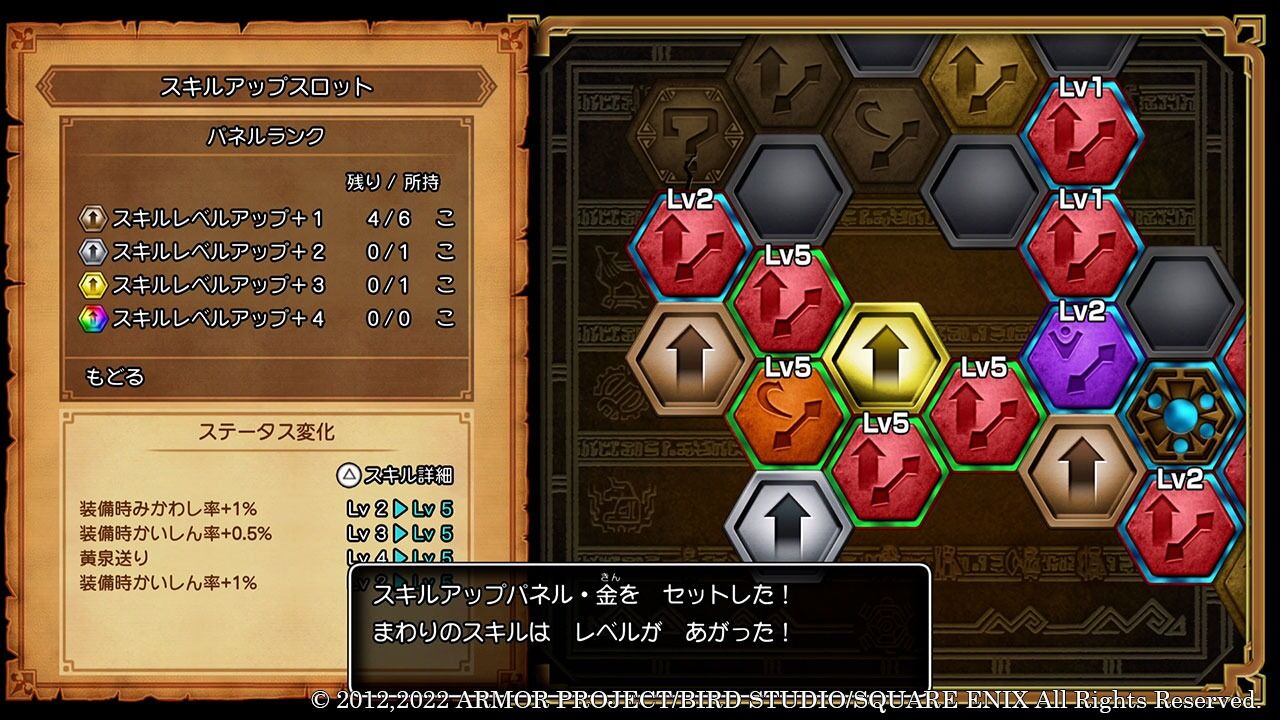 宝箱などから手に入る「スキルアップパネル」をスキルパネルの空いているスロットにはめると、周囲に配置されている特技や呪文などのレベルを上げることができる。高ランクのパネルほどレベルが大幅に上がるぞ!