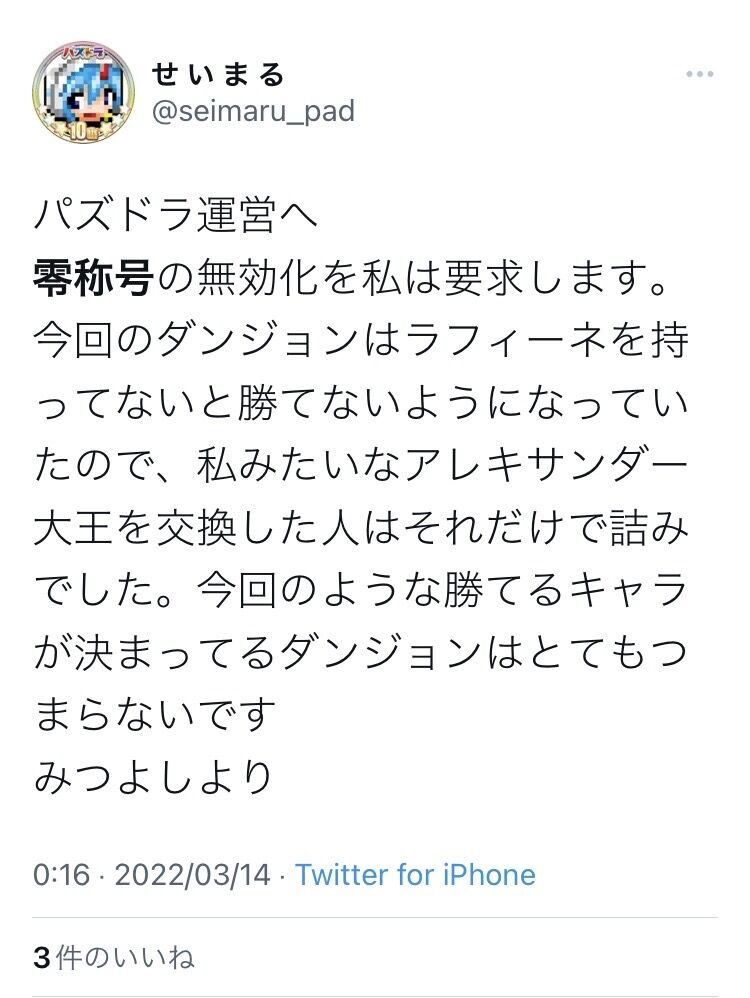【パズドラ】「零称号の無効化を」←アレキサンダー大王のツイートがバズっている模様 2022/3/14 オーガch.-パズドラ攻略まとめ速報 " " 875: おーがちゃんねる 2022/03/14(月) 00:23:32.69 ゴミ発見 続きを読む Source: オーガch.-パズドラ攻略まとめ速報