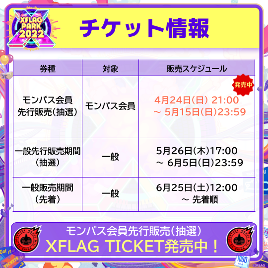 【モンスト】※行くぞおおおお!※XFLAG PARK 2022チケット!モンパス会員先行販売(抽選)申込受付開始キタ━━━━(゚∀゚)━━━━!! 2022/4/25 モンスト速報 モンスターストライクまとめ " " 続きを読む Source: モンスト速報 モンスターストライクまとめ