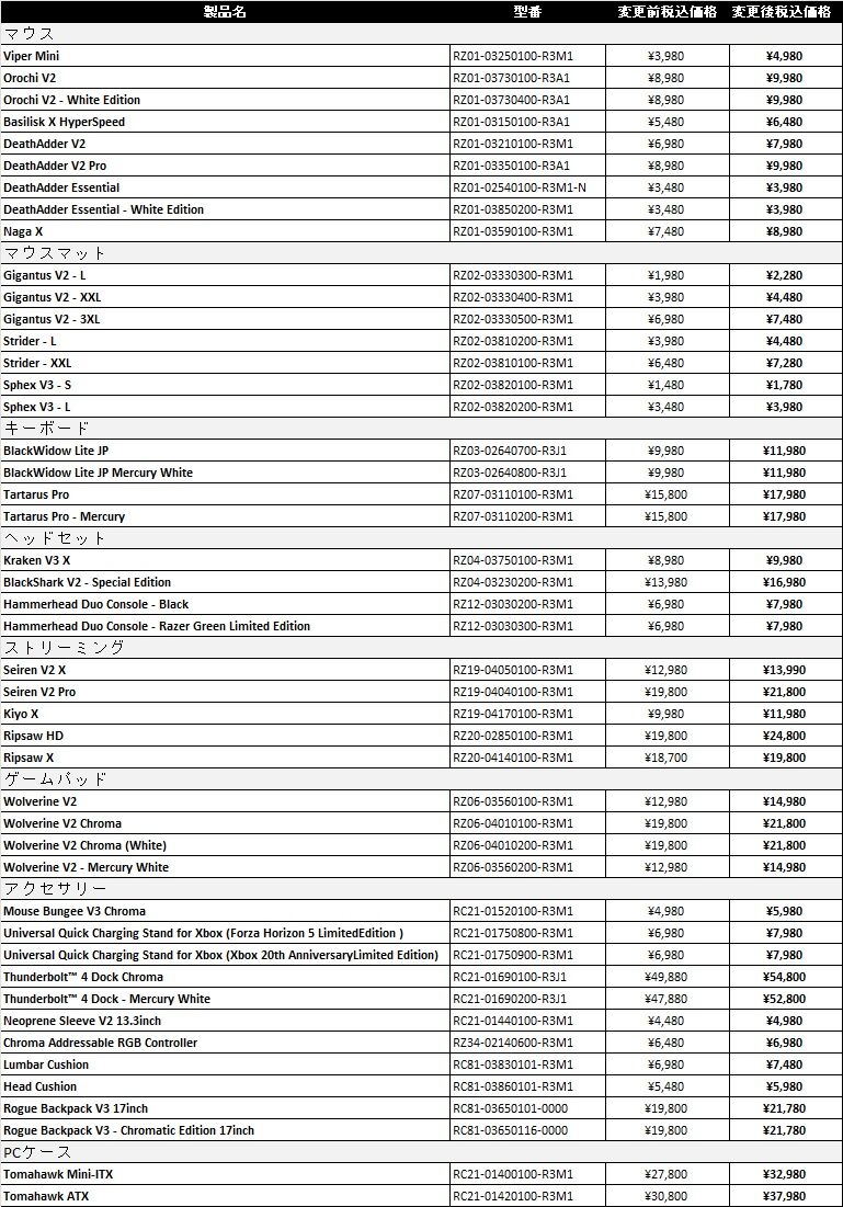 価格改定を行う該当製品は画像をご確認ください。