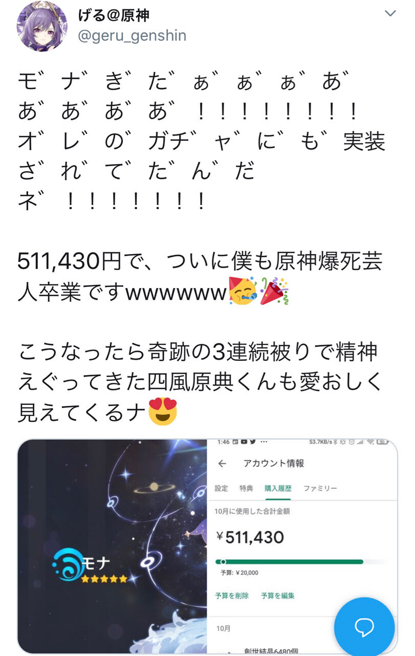 大人気ゲーム原神でキャラ1体出すために50万以上課金するユーザー現る