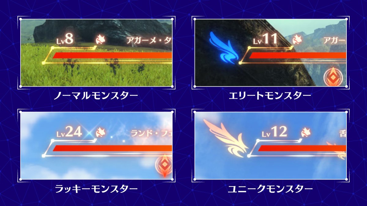 エネミーには、「ノーマル」「エリート」「ユニーク」「ラッキー」という4種類のモンスターがいて、上にあるマークで見分けることができますも。エリートはノーマルより強いから注意が必要で、中には二つ名がついた強力なユニークモンスターがいるから心してくださいも。#ゼノブレイド3