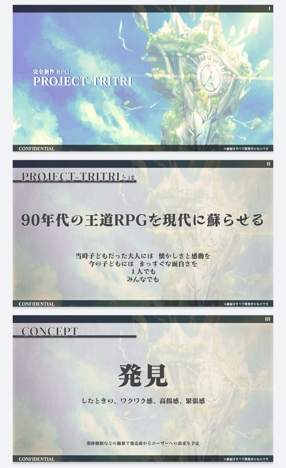人気タイトル、人気RPGに関わったクリエイターの名前が連なっており、それらのゲームやクリエイターのファンならば期待が高まることだろう。企画書には、“90年代の王道RPGを現代に蘇らせる”、“発見したときの、ワクワク感、高揚感、緊張感”といったコンセンプトが書かれていた。