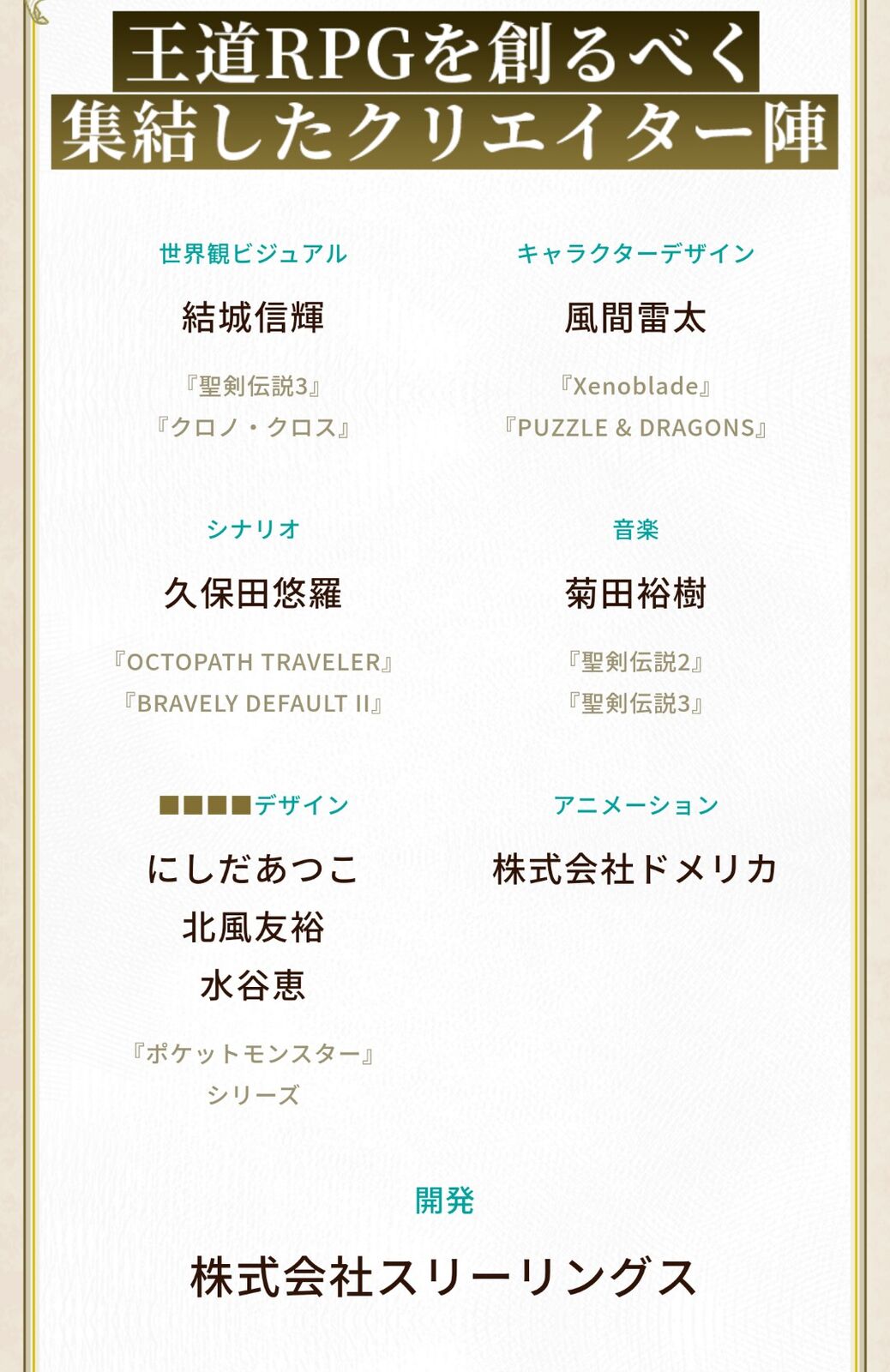 2022年5月20日、完全新作RPGのティザーサイトが公開された。この謎のティザーサイトでは、開発に参加したクリエイター陣が公開されているほか、ゲームの企画書のPDFが閲覧でき、その中にはコンセプトやストーリー、キャラクターなどの情報も掲載されている。