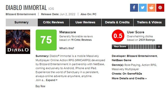 【悲報】ディアブロイモータル、ユーザースコア0.5点(10点満点) 露骨なP2W仕様で海外で低評価に 2022/6/9 Y速報 " " 1:名無しのY速報さん 2022/06/08(水) 21:17:33.07 ID:ecTlhb2W0 フィルスペンサークビで 続きを読む Source: Y速報