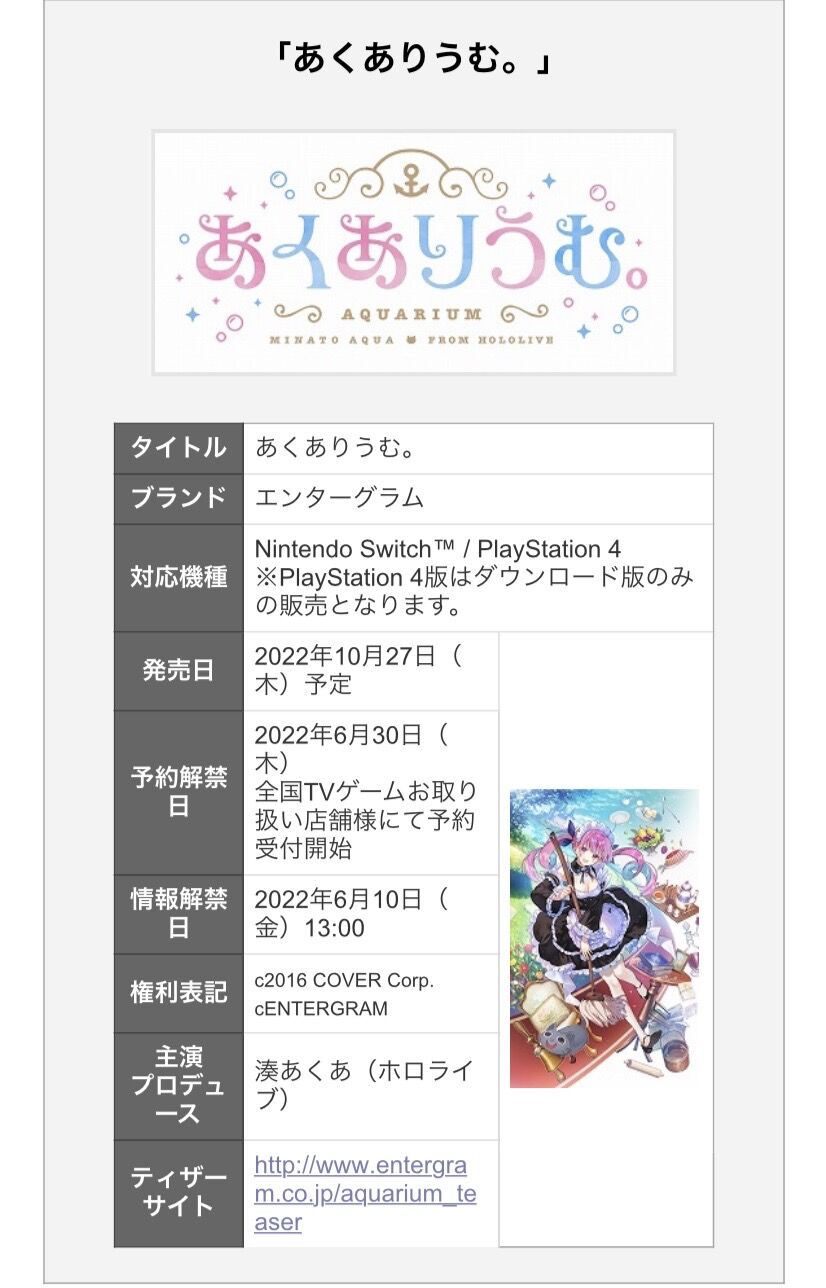 エンターグラムは本日(2022年6月10日),同社の新作タイトル「あくありうむ。」(PS4 / Nintendo Switch)を10月27日にリリースすると発表し,ティザーサイトを公開した。