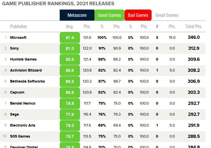 2021年のリリースの品質のみに基づいて、その年の最高のゲームパブリッシャーと最悪のゲームパブリッシャーを決定しました。販売とユーザーのレビューは、これらのランキングには考慮されていません。評論家のレビュー(各ゲームのメタスコアによってキャプチャされたもの)のみがパフォーマンスの評価に使用されます。