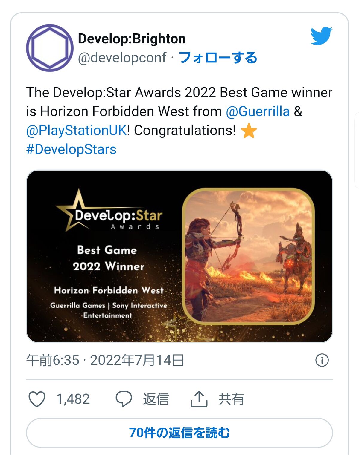 Playstation StudioのGuerrilla Gamesが制作したHorizon Forbidden Westが2022年のベストゲームを受賞しました。