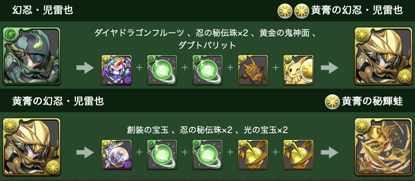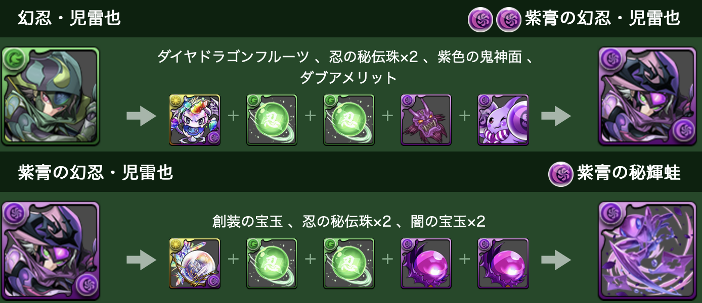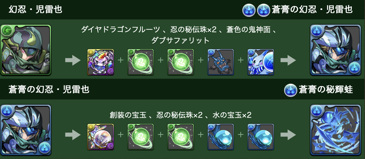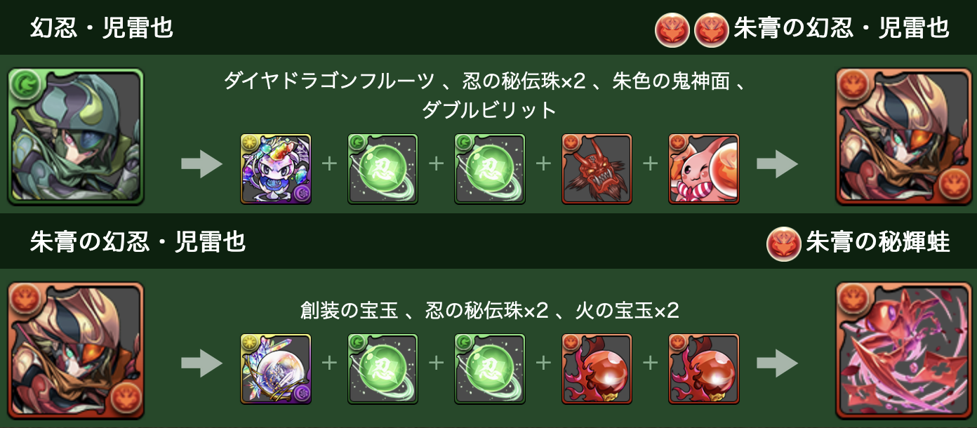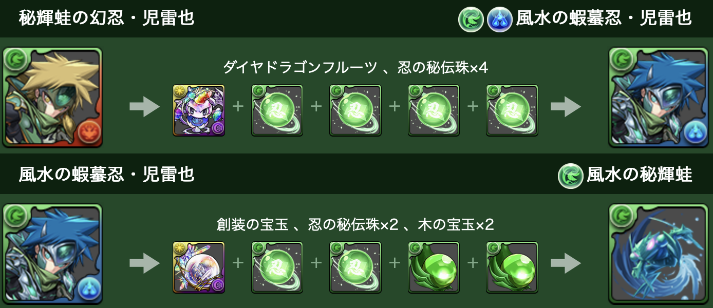 倒すとドロップする「忍の秘伝珠」は、「幻忍・児雷也」などを進化させる際に必要な進化素材となっているぞ!
