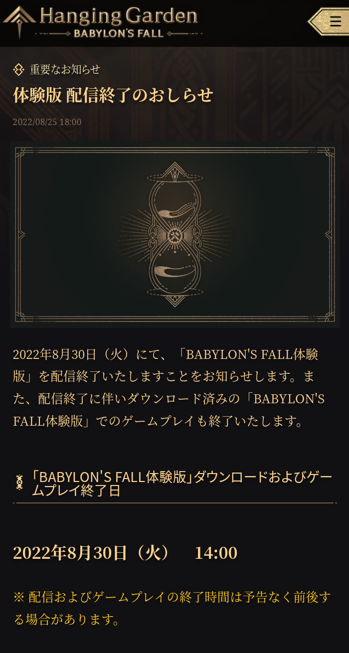 2022年8月30日(火)にて、「BABYLON’S FALL体験版」を配信終了いたしますことをお知らせします。また、配信終了に伴いダウンロード済みの「BABYLON’S FALL体験版」でのゲームプレイも終了いたします。