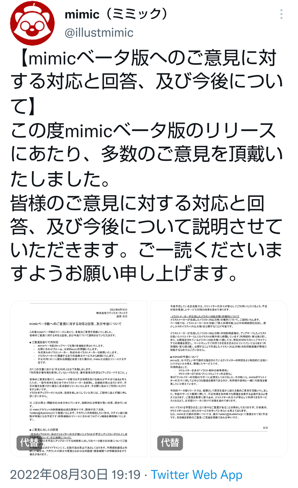 【悲報】絵柄を模倣して自動生成するAIのmimic、絵師の圧力に屈し公開停止 終わりだよこの国 2022/8/31 Y速報 " " 1: 2022/08/30(火) 19:48:52.33 ID:/NxqR9Dn0 続きを読む Source: Y速報