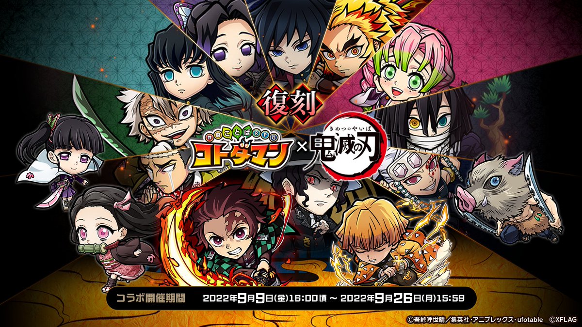 詳細はこちら!https://t.co/3ehY4gvSQb#コトダマン #鬼滅の刃 #鬼滅の刃コラボ復刻 pic.twitter.com/MtO42ocT1y— 【公式】コトダマン運営会議 (@kotodaman_pr) September 9, 2022