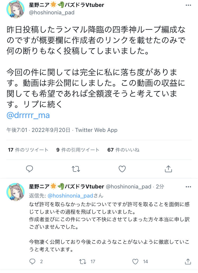【パズドラ】「許可取るのが面倒」星野ニアさんがまた炎上、一部では売名行為との見方も 2022/9/20 オーガch.-パズドラ攻略まとめ速報 " " 52: おーがちゃんねる 2022/09/20(火) 19:09:44.90 ダイケ並みの誤字起きててワロタ今までの無許可も詫びて非公開にしとけ🤣 続きを読む Source: オーガch.-パズドラ攻略まとめ速報