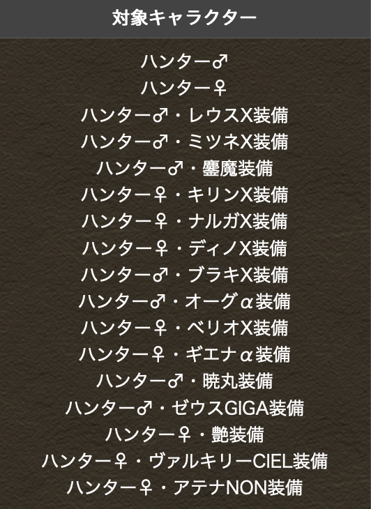 - ・「ハンター♀・アテナNON装備」などの対象キャラクターのみが潜入可能