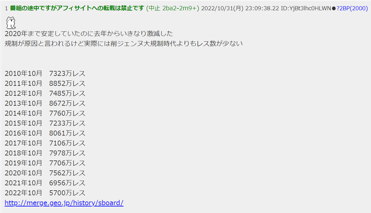 5chオワコンに 書き込みが2000万も減ってしまう・・・ 2022/11/2 Y速報 " " 1: 2022/11/01(火) 19:38:19.13 ID:LSEgQ1xlM 意味不明な規制のせいで、俺らが思っている以上に書き込みが出来ないらしい たった2年で月間レス数が2000万も減 続きを読む Source: Y速報