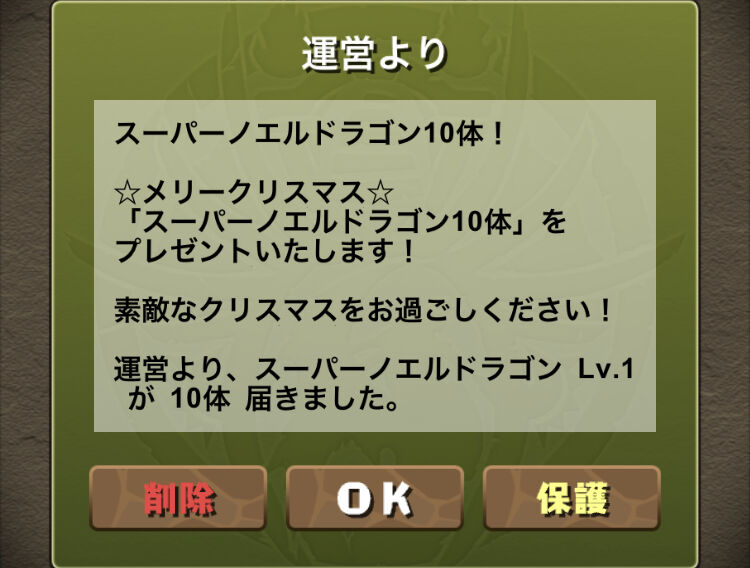 【パズドラ】昨年はクリスマス記念で魔法石25個!今年は何個貰えるかな?【結果】 2022/12/24 オーガch.-パズドラ攻略まとめ速報 " " 153: おーがちゃんねる 2022/12/24(土) 00:14:33.32 え、クリスマスプレゼントノエルドラゴンだけ?! 続きを読む Source: オーガch.-パズドラ攻略まとめ速報