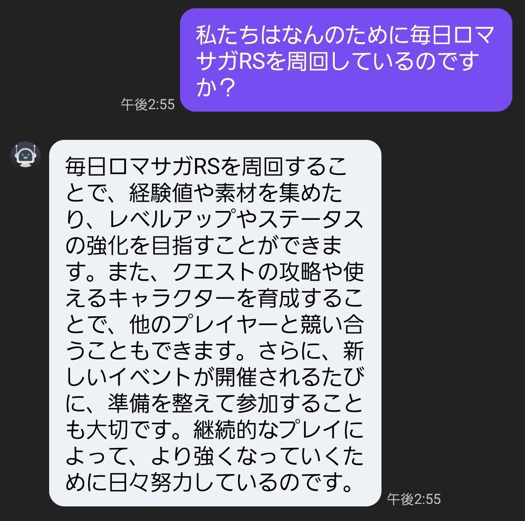 【ロマサガRS】話題のChatGPTに「RSの周回理由」を聞いてみた結果…! 2023/4/15 ロマサガRS攻略まとめ " " 681 名前ボストン速報:2023/04/11(火) 14:43:59.30 ID:NBqなぁ俺たちは何のために周回してるんだ? 続きを読む Source: ロマサガRS攻略まとめ
