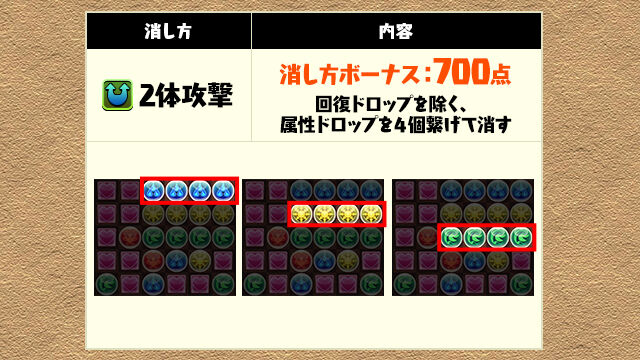 今回は「2体攻撃、4色攻撃強化、T字消し攻撃」が「消し方ボーナス」の対象となっています。
