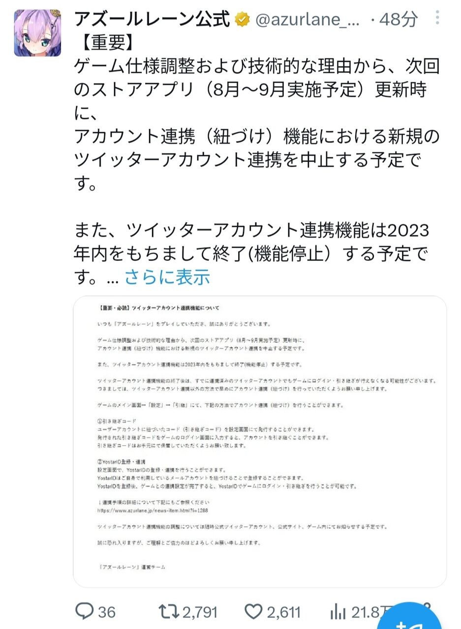 【悲報】Yostar産ソシャゲ、Twitterアカウント連携終了へ 2023/7/4 オーガch.-パズドラ攻略まとめ速報 " " 1: おーがちゃんねる 2023/07/03(月) 20:01:16.95 続きを読む Source: オーガch.-パズドラ攻略まとめ速報