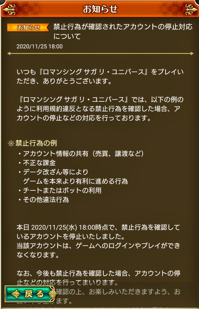 【ロマサガRS】財宝の穴終了後⇒アカウント停止のお知らせ。この流れは恒例なのね?【リユニバース】 2020/11/25 ロマサガRS攻略まとめ " " 418 名前ボストン速報:2020/11/25(水) 18:02:22.46 ID:c6e お知らせ 本日 2020/11/25(水) 18:00時点で、禁止行為を確認しているアカウントを停止いたしました。当該アカウントは、ゲームへのログインやプレイができなくなります。 続きを読む Source: ロマサガRS攻略まとめ