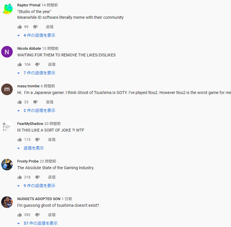 ラスアス2のGJAでのGOTY受賞の動画、低評価が過半数でコメント欄荒れる 2020/11/26 Y速報 " " 1: 2020/11/26(木) 05:50:05.76 ID:i4sDNvQn0 米欄も批判だらけな模様 続きを読む Source: Y速報