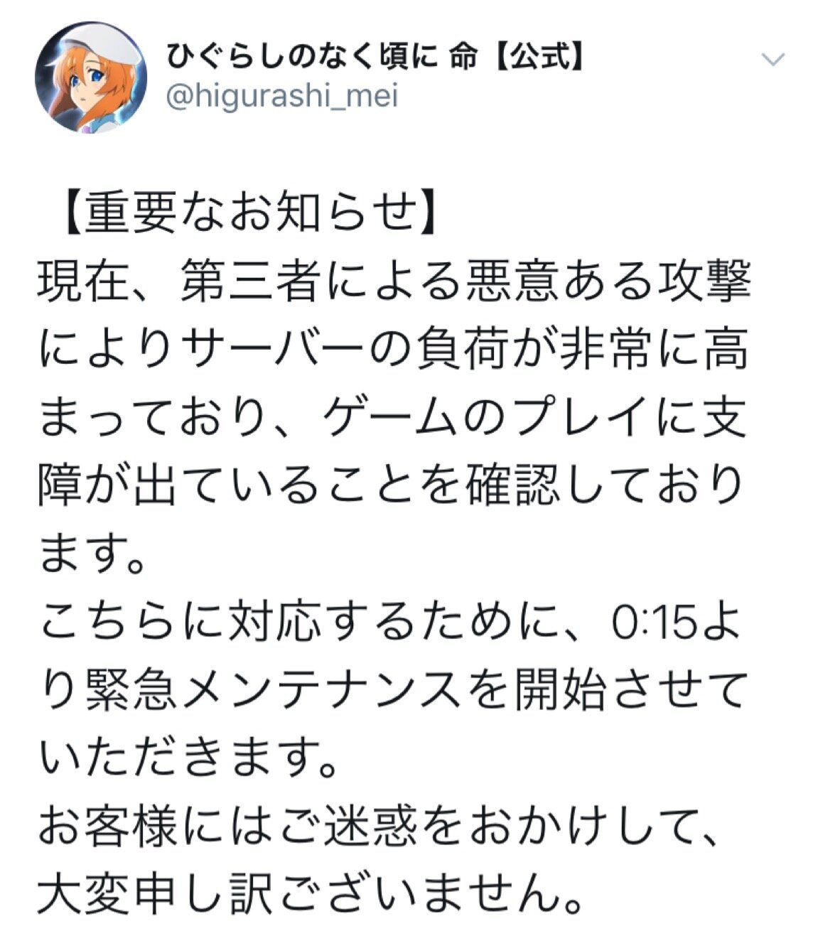 【ひぐらしのソシャゲ】サービス開始10時間、第三者の悪意ある攻撃の為5回目の緊急メンテ 2020/9/4 オーガch.-パズドラ攻略まとめ速報 " " 1: おーがちゃんねる 続きを読む Source: オーガch.-パズドラ攻略まとめ速報