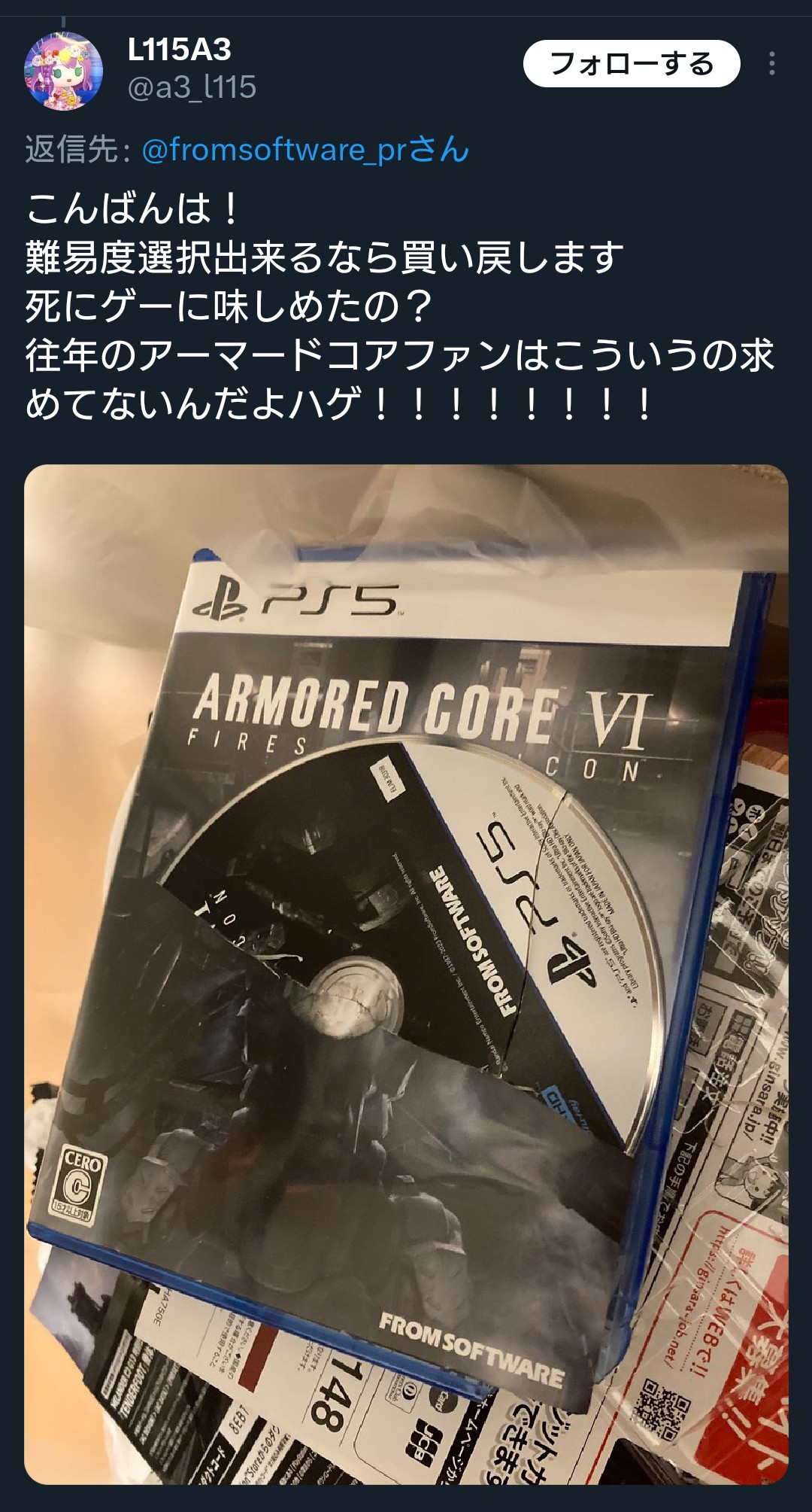 【朗報】『ヌルゲー』のアーマードコア6のボスがナーフされ往年のACファンがウッキウキではしゃぎまくってしまう 2023/9/11 ダークソウルまとめ速報 " " 451: ID:wj+U/fWqd ボス弱体化は草 続きを読む Source: ダークソウルまとめ速報