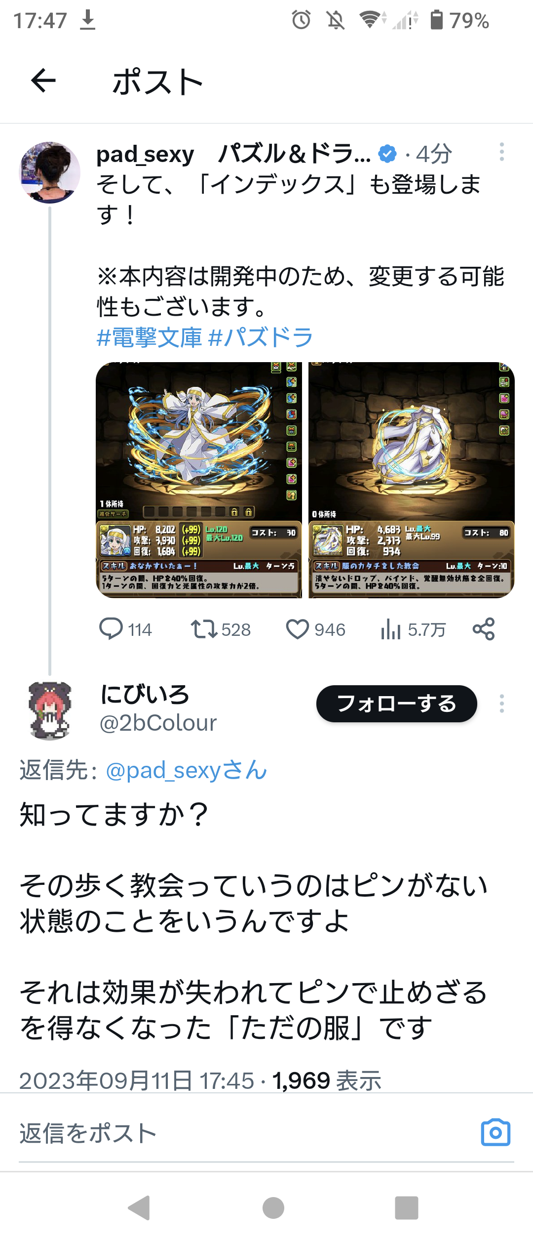 【悲報】パズドラさん、電撃文庫コラボでエアプをかましてしまう【二重チェック】 2023/9/11 オーガch.-パズドラ攻略まとめ速報 " " 112: おーがちゃんねる 2023/09/11(月) 17:48:10.35 【悲報】パズドラさんまたエアプをかましてしまう 続きを読む Source: オーガch.-パズドラ攻略まとめ速報