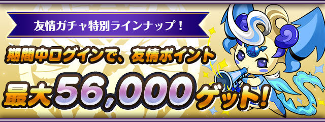 さらに、対象の期間にパズドラにログインすると、友情ポイント28,000がゲーム内メールで貰え、期間①、②を合わせると、友情ポイント最大56,000がゲットできるぞ!友情ガチャ「5600万DL記念厳選カーニバル」