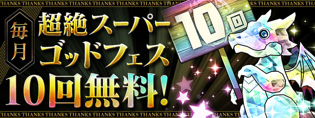 期間:12/01(火)4:00~2021/01/01(金)03:59それぞれの期間中に「超絶スーパーゴッドフェス」10回分を無料でまわすことができるぞ!