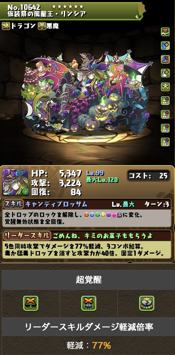 「ハロウィン」イベントのモンスターをリーダーに編成してこのダンジョンに潜入すると、「仮装祭の風龍王・リンシアの希石」と「ハロウィンガチャドラ」のドロップ率が100%にアップ!