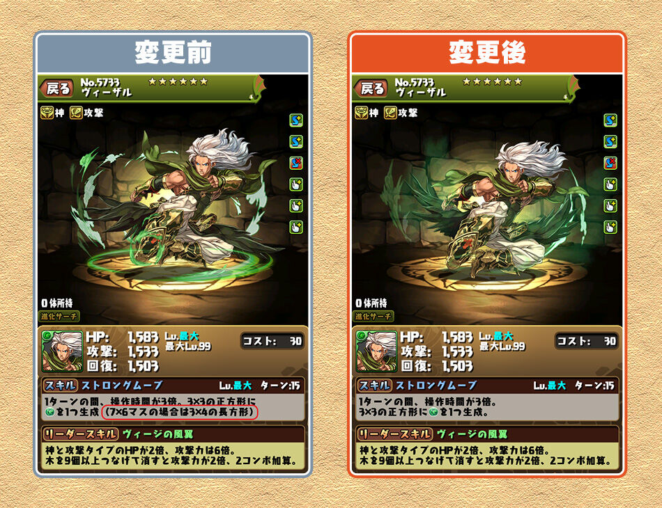 3×3の正方形に属性ドロップを生成するスキルについて、10/26(木)のデータ更新後にスキルテキストが調整されます。