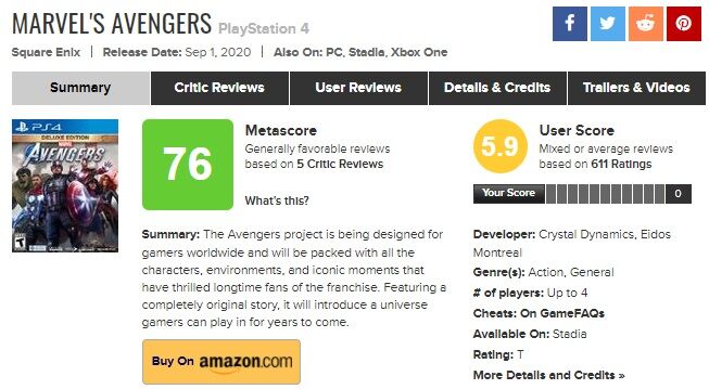 【PS4 アベンジャーズ】メタスコア76点、ユーザースコア5.9点 厳しい評価でのスタート 2020/9/4 Y速報 " " 1: 2020/09/04(金) 08:45:33.00 ID:ov9CY7TAa https://www.metacritic.com/game/playstation-4/marvels-avengers?ref=hp 続きを読む Source: Y速報