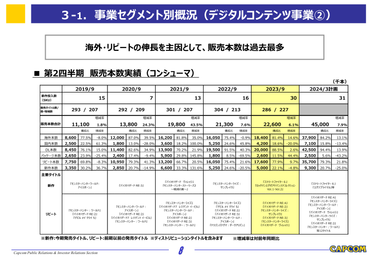 なお、1月に逆転裁判トリロジーが販売されるが、上記資料の新作投入数(SKU)では9月期から一本しか増えていないことに注目