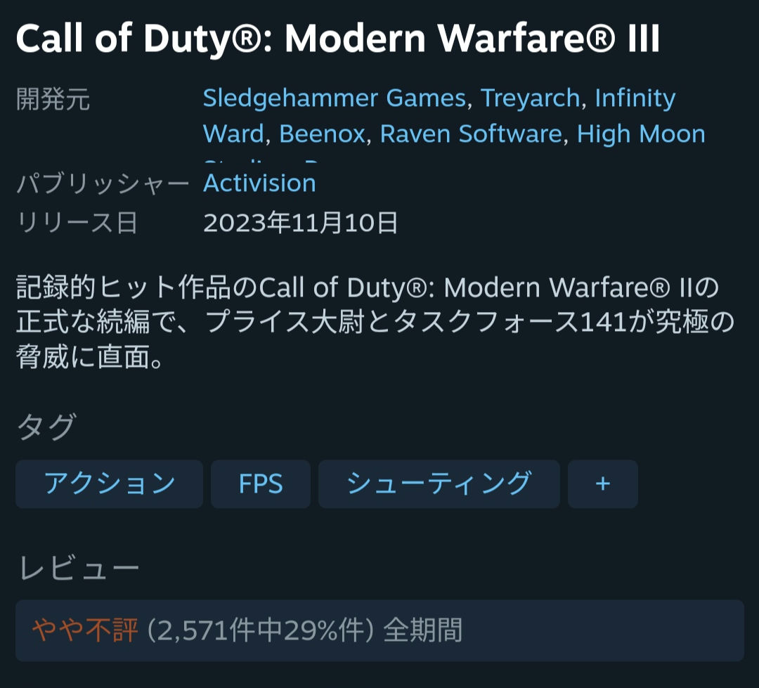 【悲報】CODMW3さん、ついにSteamの好評率30%を切ってしまう😱 2023/11/13 Y速報 " " 1: 2023/11/12(日) 13:11:11.65 ID:Z/EbE8rI0 どーすんのこれ 続きを読む Source: Y速報
