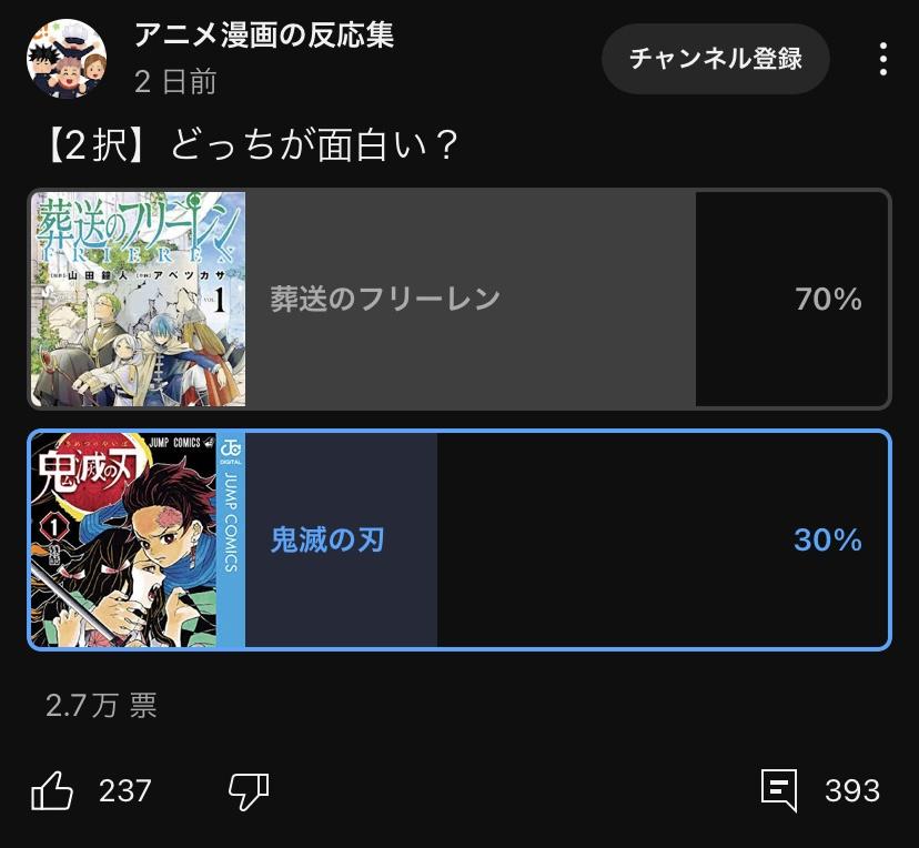 鬼滅の刃と葬送のフリーレンのどちらが面白いか?←2.7万票のアンケート結果が衝撃的 2023/11/27 Y速報 " " 1: 2023/11/26(日) 21:26:33.14 ID:t67UPVk50 葬送のフリーレン 70% 鬼滅の刃 30% 続きを読む Source: Y速報