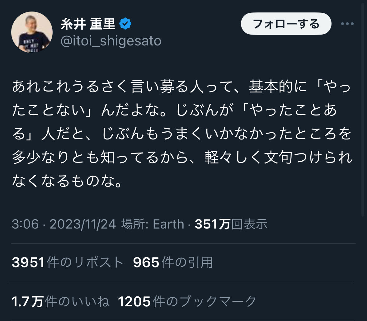 ゲーム開発者「文句を言うのは基本的にやった事ない人」→Xで大絶賛される 2023/11/29 Y速報 " " 1: 2023/11/26(日) 17:49:21.24 ID:HdDXBlxDd 作ったことある人なら大変さがわかるから文句なんて言わないのよ 続きを読む Source: Y速報