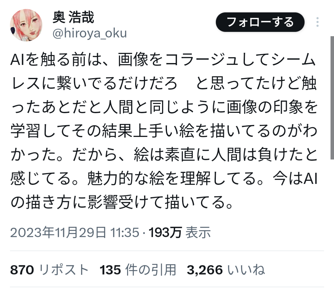 ガンツ作者「AIすごい。素直に人間の負けです」→認められなくて反AI発狂 2023/12/3 Y速報 " " 1: 2023/12/01(金) 07:58:04.68 ID:tg1Q1Yix0 ↓ 続きを読む Source: Y速報