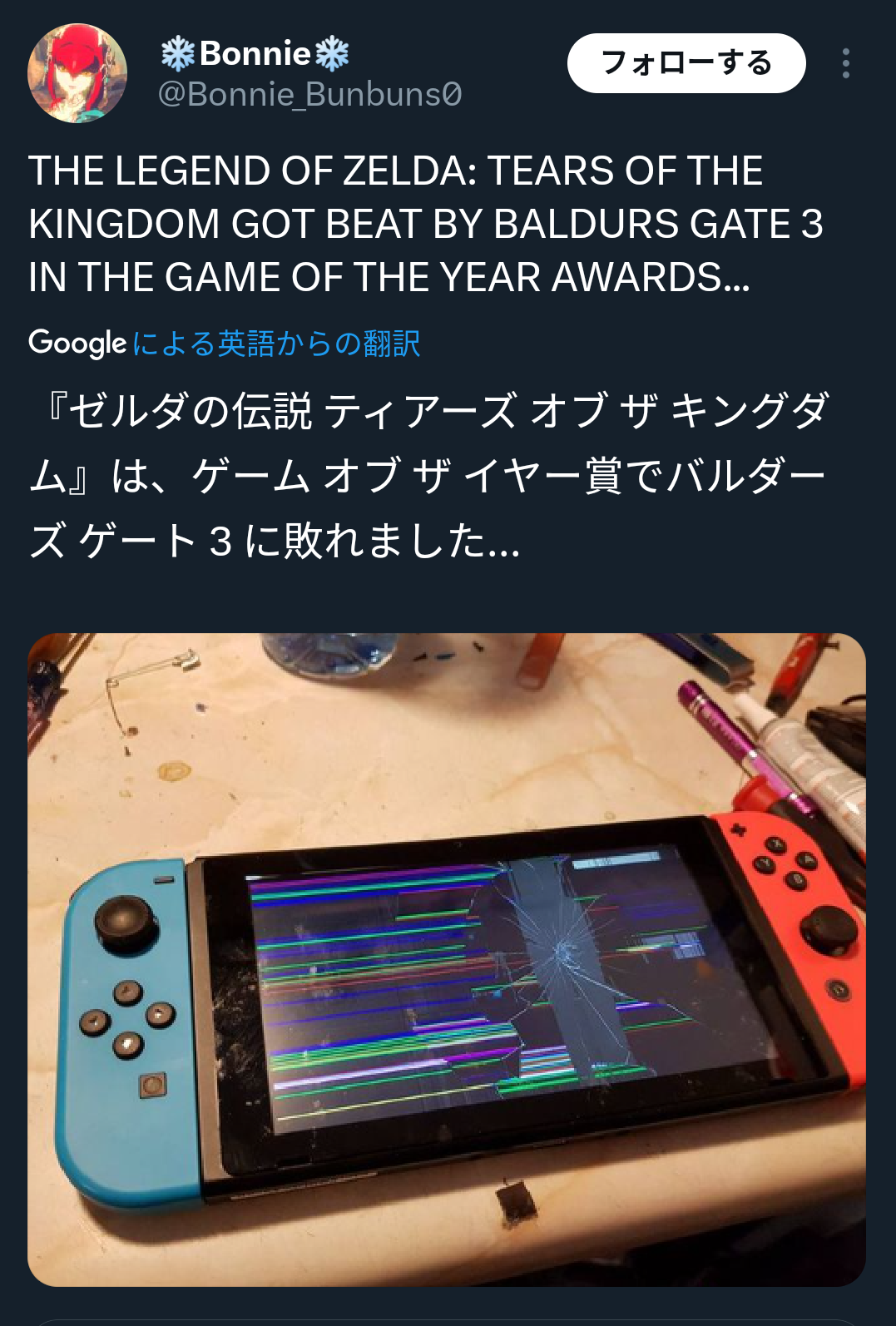 海外任天堂オタク「ティアキンがGOTY取れないならSwitchぶっ壊す!!」 → 結果www 2023/12/11 Y速報 " " 1: 2023/12/10(日) 19:33:30.16 ID:T2nJuGPO0 続きを読む Source: Y速報