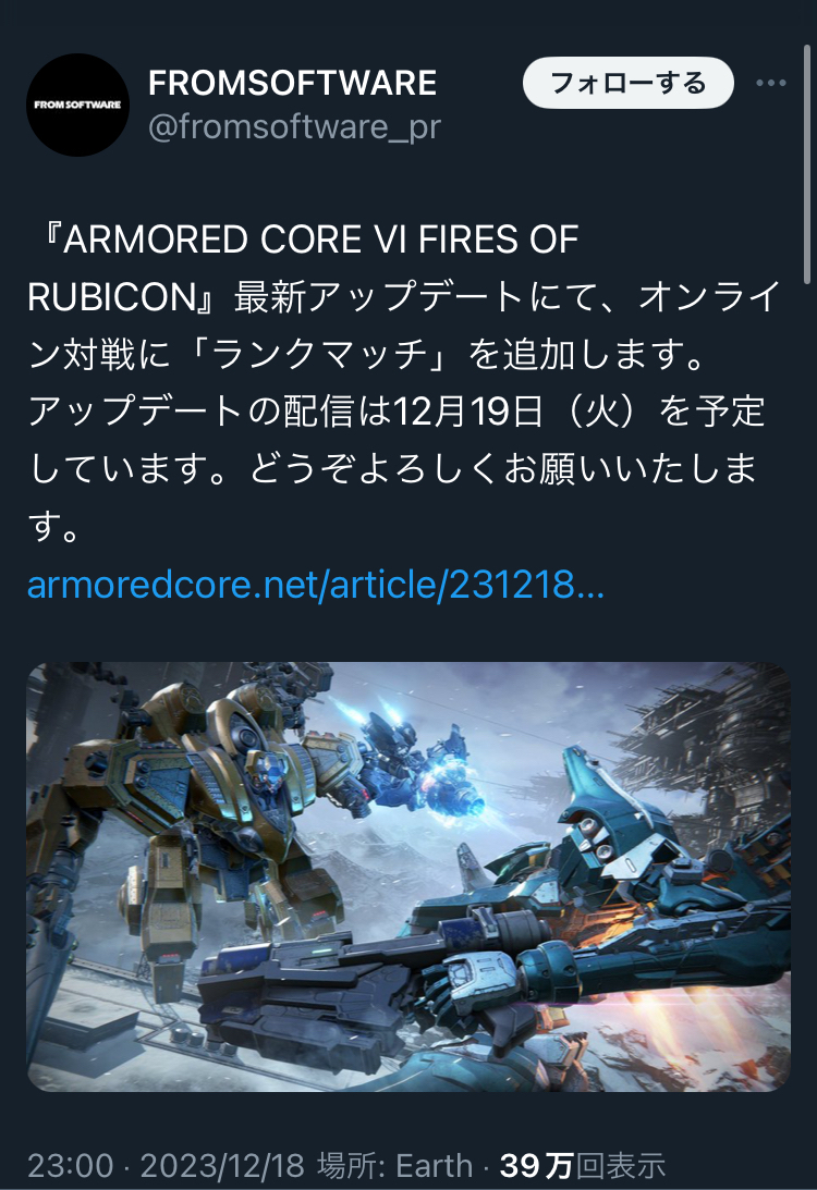 【朗報】アーマードコア6、最新アプデでランクマッチ追加へ 2023/12/19 ダークソウルまとめ速報 " " 1: ID:KcagtVlo0.net https://x.com/fromsoftware_pr/status/1736748163854446959 続きを読む Source: ダークソウルまとめ速報